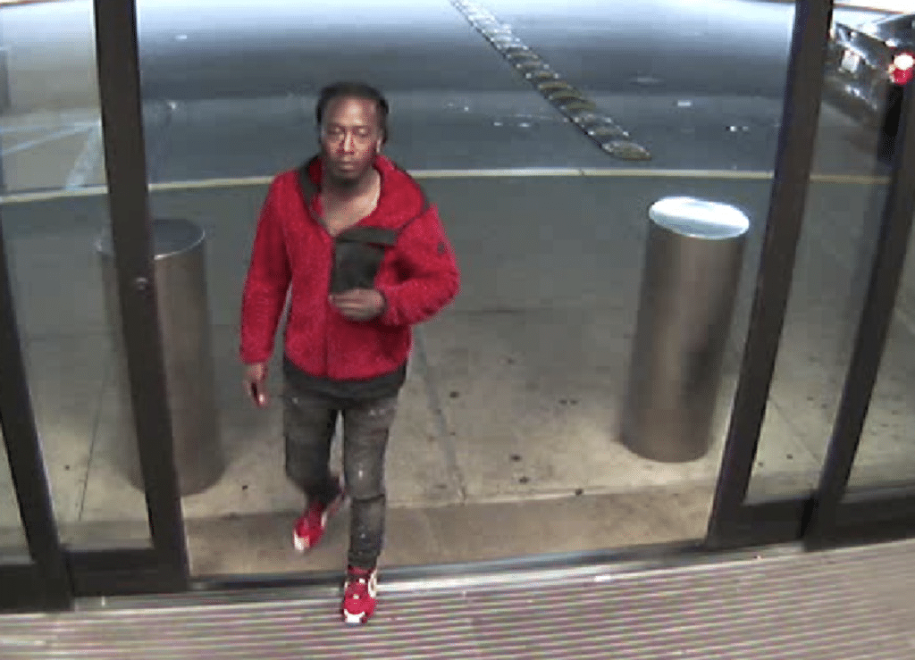 The suspect is described as a black male with short dreadlocks wearing a red jacket, black jeans and red shoes.