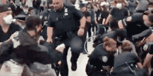 NYPD broke up the gathering of BLM rioters and protesters at the Barclays Center in Brooklyn. An officer was reportedly struck with with a garbage can during the clash. #GeorgeFloyd #BlackLivesMatter #antifa pic.twitter.com/UoJ6T9i9iU