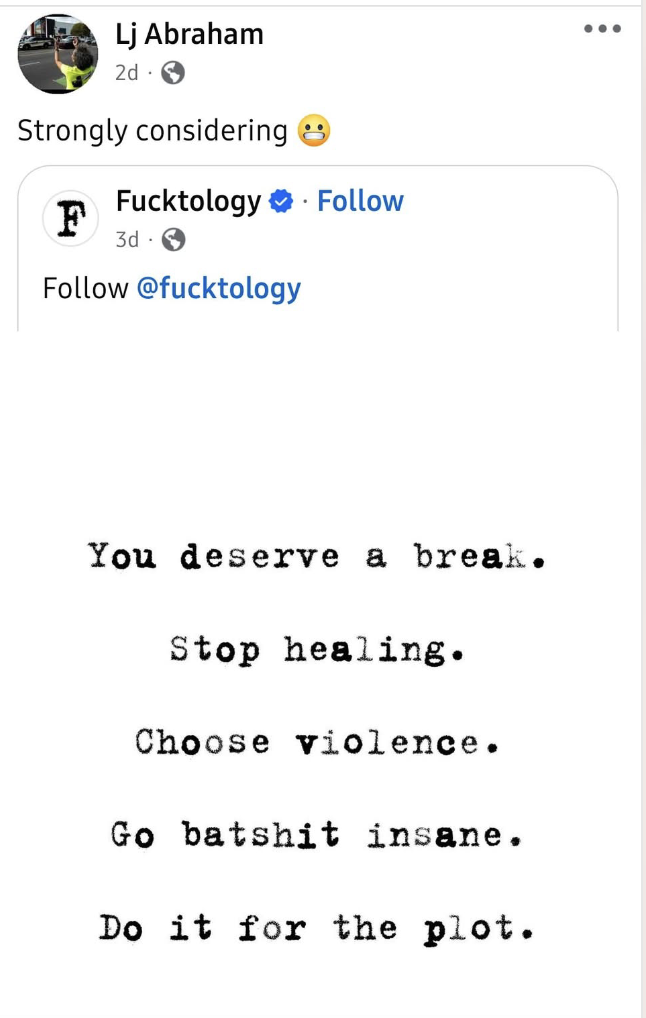 Yet, Abraham responded on social media to a post noting that she was “strongly considering” violence. See below: