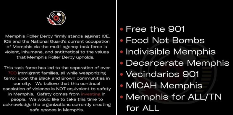 “ICE and the National Guard’s current occupation of Memphis via the multi-agency task force is violent, inhumane and antithetical to the values that Memphis Roller Derby upholds.”