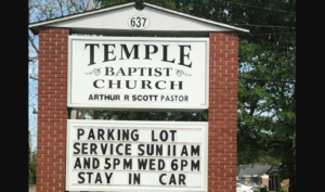 The U.S. Department of Justice filed a statement of interest in the case, Temple Baptist Church v. City of Greenville, agreeing with the church that the ban cannot single out churches while allowing similar types of activities elsewhere, such as drive-in restaurants.